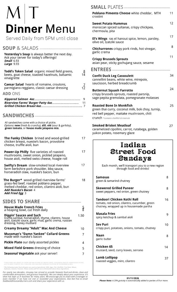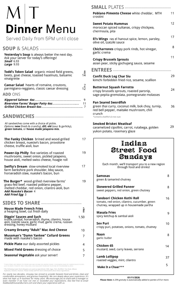 Muss & Turner’s will be closed on Monday, January 5, as we gather for our annual holiday party. We will also be closed for lunch the following day.